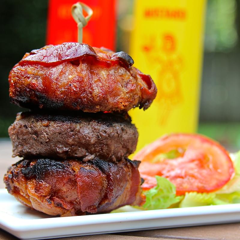 To assemble the burgers, place each patty on one bacon disk (i.e., the bottom of the bacon bun). Add condiments (optional) and top with the top of the bacon bun. Serve immediately.