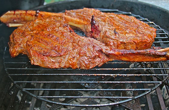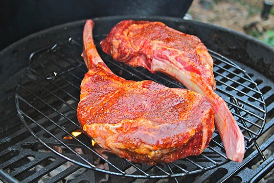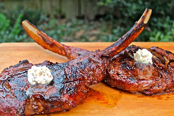 Smoked and Grilled Tomahawk Ribeyes with Shallot-Garlic Butter and Basic Steak Dry Rub